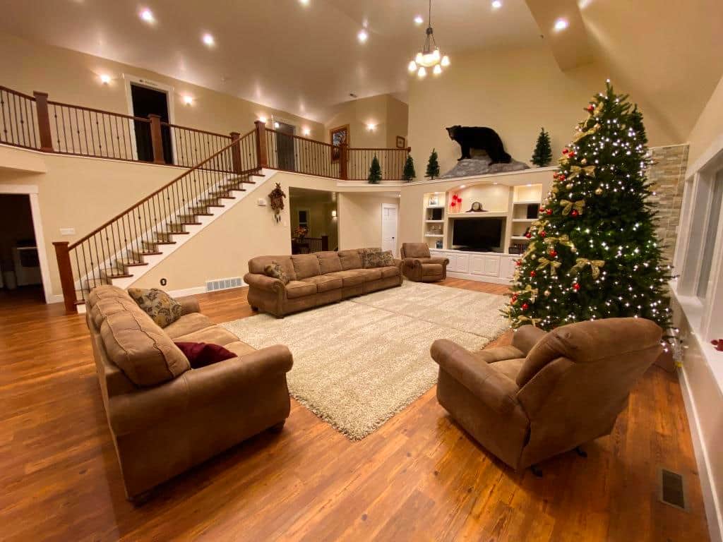 In the basement you'll find a 14-seat theater room with tiered seating, a 120-inch projection screen, and surround sound audio. Additionally, there is a recreation room with ping-pong and air hockey tables. There are two large bunk rooms downstairs that sleep 10 & 12.